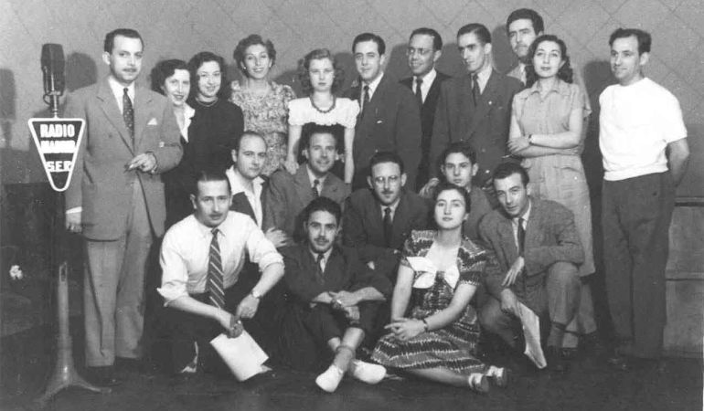 Guillermo Sautier Casaseca, de rodillas con camisa blanca y corbata, acompañado por el cuadro de actores de Radio Madrid tras una grabación. / Cadena SER