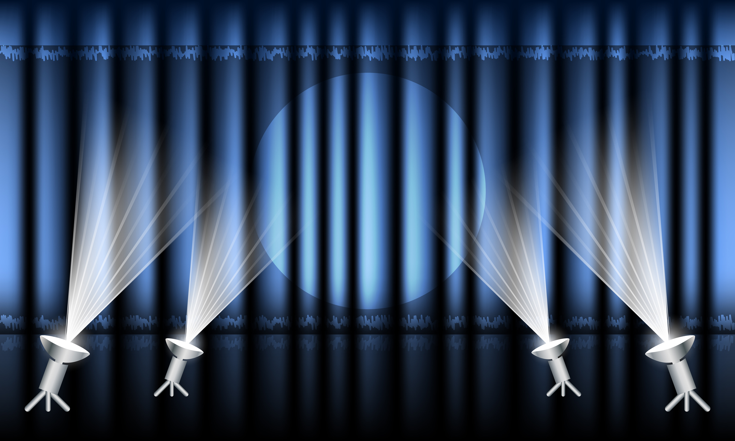 Theater stage with blue curtain and spotlights. Vector illustration.